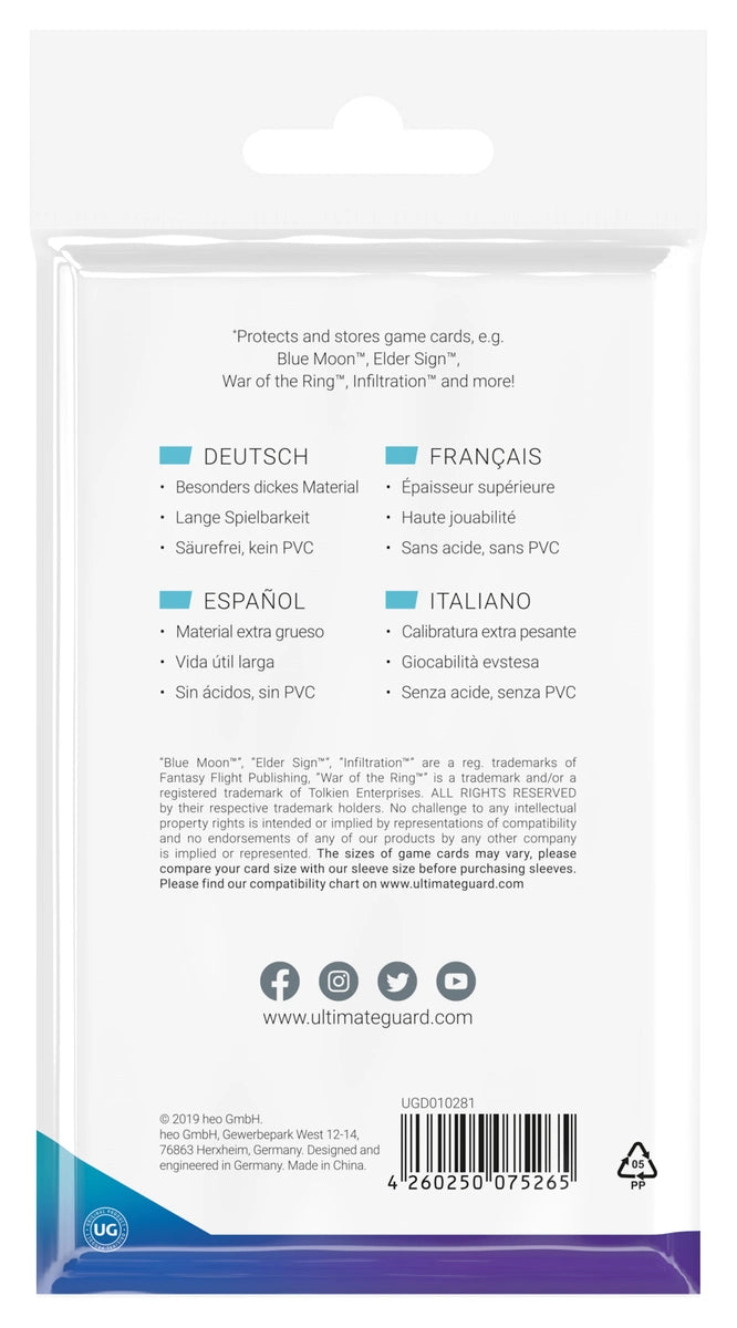 Board Games Sleeve – Tarot (73x122mm) (100) have clear front & clear back. For cards measuring 73×122 mm (23/4 x 43/4”). This card size is used in games like ‘Elder Sign’, ‘Mystic Vale’, ‘XCOM’, ‘Yedo’, ‘Blue Moon’ and many more.