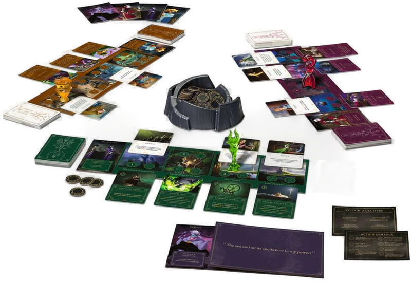 Play as Maleficent, Captain Hook, Ursula, or Prince John. Each Villain boasts thematic cards and strategies inspired by the films you love. Villain Guides and video instructions help you start playing in minutes.In this asymmetric board game, players take turns striving to achieve their own sinister objectives. Move your Villain to different locations from their film to access actions: gain power, play helpful minions and items from your hand, or thwart your opponents with heroes.