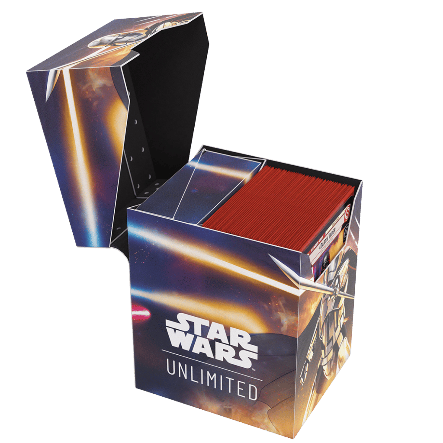 The Star Wars: Unlimited Soft Crate is the all-in-one affordable solution for Star Wars: Unlimited players. This full color printed and officially licensed deck box is packed with ingenious features. It protects a full double-sleeved deck of cards and includes an innovative token box! This token box has a smart click-lock mechanism to keep all tokens safely stored – even while pulling it out. Once opened, the lid of the box stays upright for convenient access during gameplay. The Soft Crate comes in three additional amazing designs and is a must-have for every Star Wars: Unlimited player as well as all fans of the franchise.