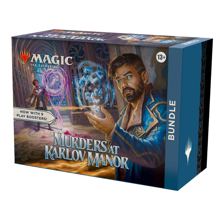A series of shocking murders involving some of Ravnica’s most powerful citizens has the city on the verge of chaos. Now detectives are on the case . . . and you’re one of them. Return to the fan-favorite plane of Ravnica in Murders at Karlov Manor, Magic’s unique take on the murder mystery genre. This Murders at Karlov Manor Bundle contains 9 Murders at Karlov Manor Play Boosters, plus 1 Traditional Foil card with Bundle-exclusive alternate-art, 15 Traditional Foil Basic Land cards (5 with Full Art), 15 nonfoil Basic Land cards (5 with Full Art), 1 oversized Spindown life counter, 1 card storage box, and 2 reference cards. Each Play Booster contains 14 Magic: The Gathering cards and 1 Token/Ad card, Suspect Punchout card, or Art Card (Art Card found in 35% of packs). Every pack includes a combination of 1–4 cards of rarity Rare or higher and 3–6 Uncommon, 6–9 Common, and 1 Land cards. One card of any rarity is Traditional Foil. The Land card is also Traditional Foil in 20% of boosters, and a special bonus card from Magic’s history can be found in 12% of boosters. Rulebook not included.