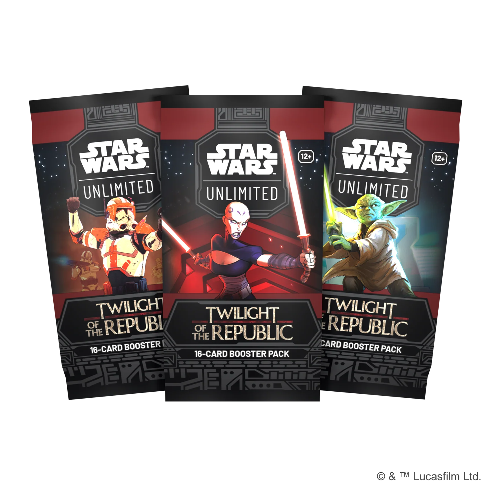Enter a galaxy of endless possibilities in Star Wars™: Unlimited! In this fast-paced, easy-to-lean trading card game, you and your opponent face off in exciting head-to-head battles full of iconic Star Wars characters. In this booster pack display for the game's third set, Twilight of the Republic, you'll find 24 individually wrapped booster packs. Each pack contains 9 common cards, 3 uncommon cards, 1 rare or legendary card, 1 leader, 1 base/token, and 1 foil card.